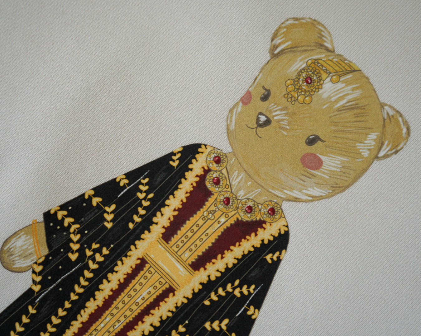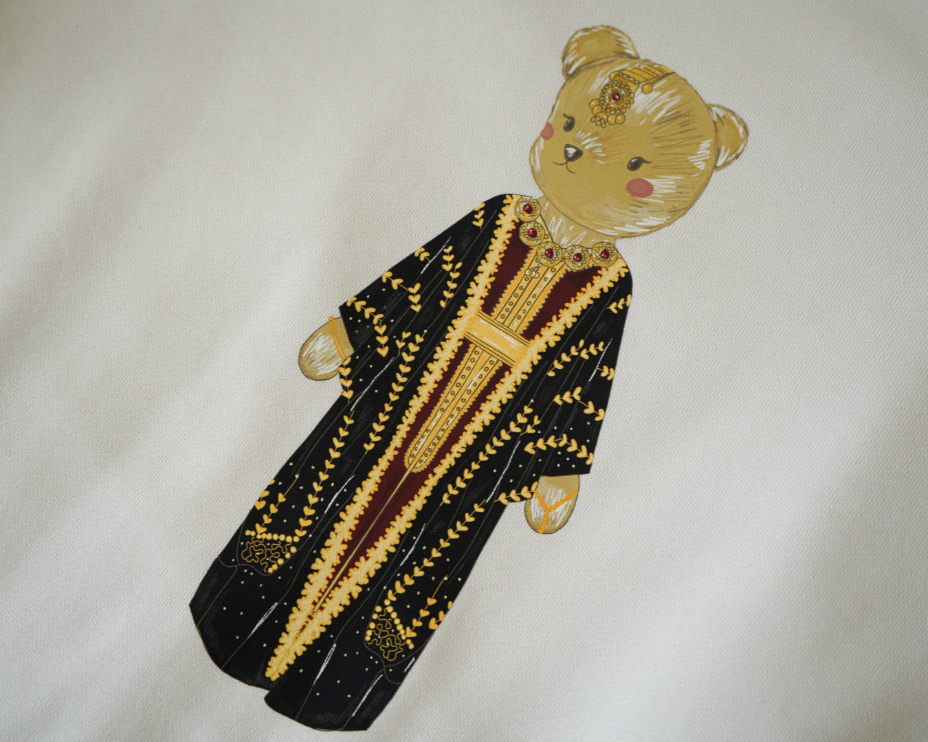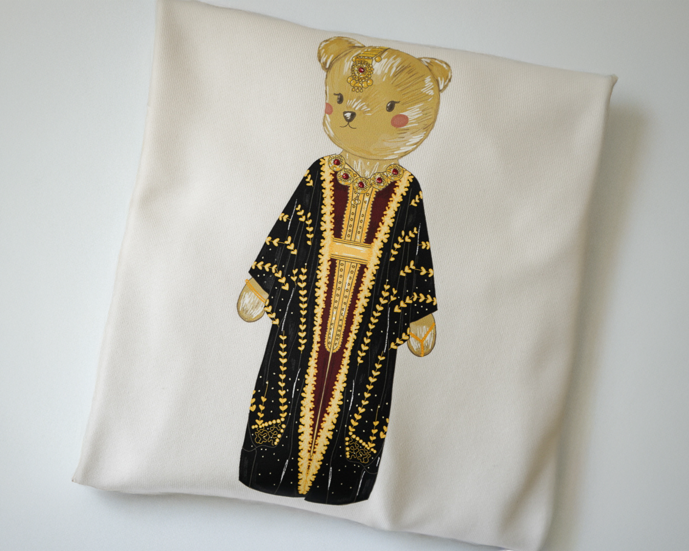 A thoughtfully hand-drawn design inspired by an authentic Iraqi Hashmi dress, typically a maroon gown with a black abaya. Perfect for casual outings yet classy enough to elevate your look with elegance.